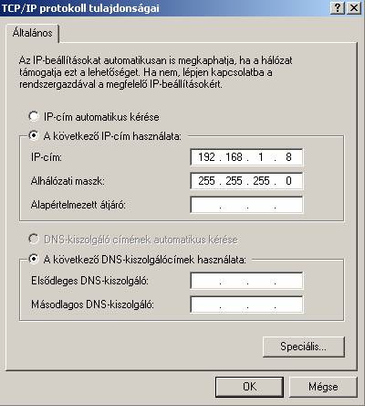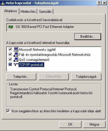 Jelölje ki a TCP/IP protokoll-t Windows XP –nél. Windows 98 alatt ugyan ez a folyamat, de ott TCP/IP NE 2000 kompatibils-t kell kijelölni.